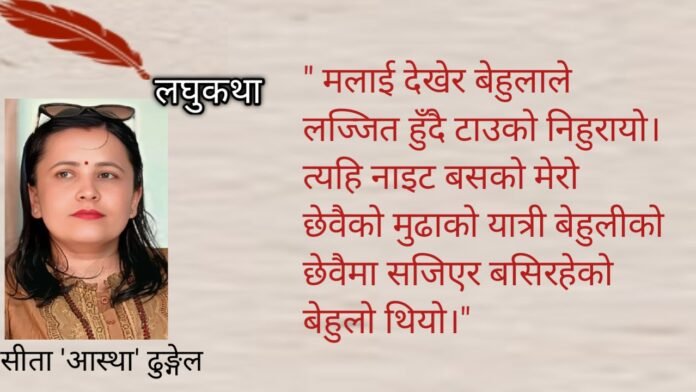 दुईचार दिन पिछाडी । म काकाकी छोरीको बिहेमा गएँ।मलाई देखेर बेहुलाले लज्जित हुँदै टाउको निहुरायो।त्यहि नाइट बसको मेरो छेवैको मुढाको यात्री बेहुलीको छेवैमा सजिएर बसिरहेको बेहुलो थियो ।