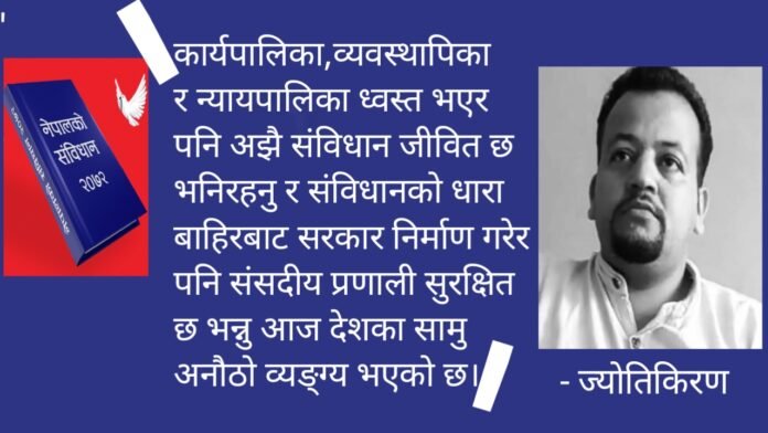 राज्यका प्रमुख तीन अंग कार्यपालिका, व्यवस्थापिका, न्यायपालिकाका साथसाथै देशभरका सार्वजनिक सम्पत्ति, राजनीतिक दलका कार्यालय, निजी निवास तथा निजी क्षेत्रका ठुला व्यवसायिक प्रतिष्ठान जेनजी आन्दोलनका क्रममा ध्वस्त भए । कार्यपालिका,व्यवस्थापिका ,न्यायपालिका ध्वस्त भएर पनि अझै संविधान जीवित छ भनिरहनु र संविधानको धारा बाहिरबाट सरकार निर्माण गरेर पनि संसदीय प्रणाली सुरक्षित छ भन्नु आज देशका सामु अनौठो व्यङ्ग्य भएको छ। तर यस्तो अनौठो व्यङ्ग्यलाई पनि ठूला राजनीतिक पार्टीका शीर्ष नेताहरूले हार्दिकतापूर्वक आत्मसात गरेको देखिन्छ। निर्वाचनमा जान सबै दलहरू तयार भएका अभिव्यक्तिहरू सार्वजनिक भएका छन् । अन्तरिम सरकारका प्रधानमन्त्री सुशीला कार्की नेतृत्वको सरकारलाई दिइएको म्यान्डेट पनि तोकिएको मितिमा नै निर्वाचन गराउनु हो भनिएको छ तर अन्तरिम सरकारले निर्वाचन गराउने संवैधानिक बाधालाई दलहरूले निरन्तर लुकाइरहेका छन्। दलहरूले राजनीतिक सहमतिको निर्णयलाई राजनीतिक सहमतिको निर्णय हो भन्नुको सट्टा संविधानको धारा ६१ को फुर्को जोडेर अन्तरिम सरकारको निर्माणको व्याख्यामा जसरी गल्ती गरिरहेका छन् यो गल्तीको असर फागुन २१ गते हुने भनिएको निर्वाचनको सन्दर्भमा टट्कारो भएर देखापर्ने स्थिति छ । संसद् विघटनले संविधान नै क्षत–विक्षत भएको अवस्थामा निर्वाचन तोकिएकै मितिमा हुन्छ भनेर विश्वास गर्नु दलहरूको गम्भीर मूर्खता हो।