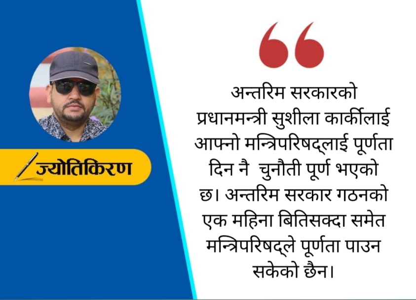 अन्तरिम सरकारको प्रधानमन्त्री सुशीला कार्कीलाई आफ्नो मन्त्रिपरिषद्लाई पूर्णता दिन नै चुनौती पूर्ण भएको छ। अन्तरिम सरकार गठनको एक महिना बितिसक्दा समेत मन्त्रिपरिषद्ले पूर्णता पाउन सकेको छैन। अन्तरिम सरकारको मुख्य जिम्मेवारी चुनाव गराउनु मात्र छैन। सुशीला कार्कीका काँधमा संक्रमणकाल व्यवस्थापन गर्नु, जेनजीका माग सम्वोधन गर्नु र भूराजनीतिक संवेदनशीलतालाई पर्गेल्नुपर्ने जटिल दायित्व पनि छ। यसकालागि मन्त्रिपरिषद् सानो,समावेशी र चुस्त दुरुस्त हुनु पर्ने स्थिति छ तर यस्तो स्थिति छ भन्दैमा प्राविधिक विशेषज्ञहरूलाई मात्र राखेर बनाइने टेक्निकल मन्त्री परिषदले वर्तमान राजनीतिक सङ्क्रमणकालको निकास दिन सक्ने अवस्था पनि छैन अर्कातर्फ सरकारमा राजनीतिक भागबन्डाको सन्तुलन आन्दोलनको मर्म पनि होइन यही कारण एक महिनासम्म पनि मन्त्रिपरिषद्ले पूर्णता पाउन सकिरहेको छैन भन्ने कुरा सहज रुपमै बुझ्न सकिन्छ। तर जस्तै जटिलता भए पनि यसैको बीचबाट मन्त्रिपरिषद्लाई पूर्णता दिनु अनिवार्य छ। यस्तो जटिल अवस्थामा थप मन्त्रीहरू चयन गर्दा उनीहरूको दक्षता, निष्पक्षता र राजनीतिक सुझबुझको गहिरो मूल्यांकन गर्ने ढंग पुगेको अवस्थामा केही सहज हुन सक्छ । विवादरहित र सबैलाई मान्य हुने व्यक्तिहरूलाई छनोट गर्नु र मन्त्रालयको बाँडफाँडमा विवेक युक्त निर्णय लिन सक्नु धेरै नै चुनौती पूर्ण कुरा रहेको देखिन्छ ।