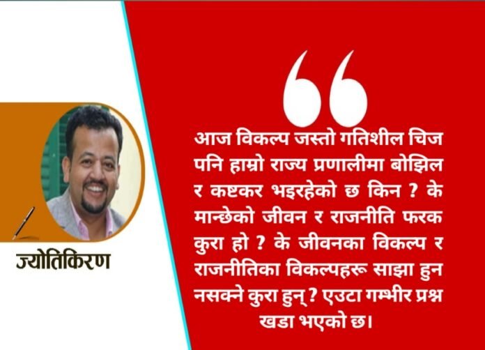 शिक्षा, पेशा, सम्बन्ध, राजनीति र व्यक्तिगत जीवनका हरेक क्षेत्रमा विकल्पहरु हुन्छन्। विद्यार्थीले कुन विषय पढ्ने ? जागिरेले कुन पेशा रोज्ने ? राजनीतिज्ञले कुन विचारधारा र राजनीतिक दल रोज्ने ? वा व्यक्तिले कस्तो जीवनशैलीको छनोट गर्ने ? भन्ने जस्ता प्रश्न विकल्पकै उदाहरण हुन्। प्रत्येक विकल्पका आफ्नै फाइदा र बेफाइदा हुन्छन्। जसको गहिरो अध्ययन र मूल्याङ्कन आवश्यक हुन्छ। विकल्पको अभाव हुन्थ्यो भने वा विकल्पको अभाव भयो भने जीवन एक निश्चित मार्ग मात्र भएर रहन बाध्य हुने थियो । जसमा नयाँपन र आविष्कार कम हुन्थ्यो। विकल्पहरूले हामीलाई नयाँ सम्भावनाहरू खोज्न,जोखिम मोल्न र आफ्नो क्षितिज फराकिलो बनाउन प्रोत्साहित गर्दछ। यसले व्यक्तिगत विकास मात्र होइन समाजको प्रगतिमा समेत टेवा पुर्याउँछ तर आज विकल्प जस्तो गतिशील चिज पनि हाम्रो राज्य प्रणालीमा बोझिल र कष्टकर भइरहेको छ किन ? के मान्छेको जीवन र राजनीति फरक कुरा हो ? के जीवनका विकल्प र राजनीतिका विकल्पहरू साझा हुन नसक्ने कुरा हुन् ? एउटा गम्भीर प्रश्न खडा भएको छ।