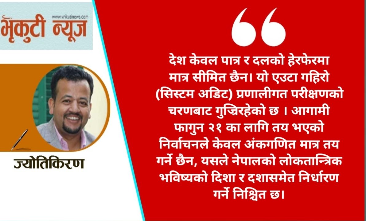 नेपाली राजनीति यतिबेला इतिहासकै एउटा यस्तो कठिन मोडमा उभिएको छ, जहाँ पुराना संरचनाहरूको असान्दर्भिकता र नयाँ आकांक्षाहरूको उदयबीच तीव्र घर्षण भइरहेको छ। वि.सं. २०८२ को यो आरम्भसँगै देश केवल पात्र र दलको हेरफेरमा मात्र सीमित छैन। यो एउटा गहिरो (सिस्टम अडिट) प्रणालीगत परीक्षणको चरणबाट गुज्रिरहेको छ । आगामी फागुन २१ का लागि तय भएको निर्वाचनले केवल अंकगणित मात्र तय गर्ने छैन, यसले नेपालको लोकतान्त्रिक भविष्यको दिशा र दशासमेत निर्धारण गर्ने निश्चित छ।