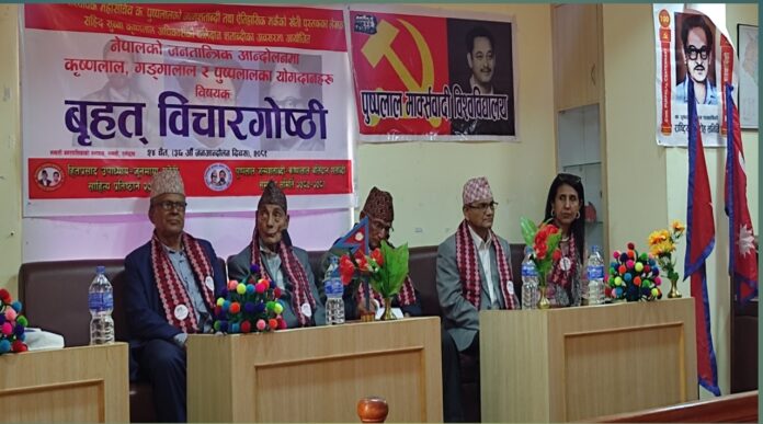 २६ चैत्र, रामेछाप। रामेछापको मन्थलीमा “नेपालको जनतान्त्रिक आन्दोलनमा कृष्णलाल,गङ्गालाल र पुष्पलालका योगदानहरु” विषयक बृहत विचार गोष्ठी सम्पन्न भएको छ । पुष्पलाल अध्ययन समाजका अध्यक्ष लोककृष्ण भट्टराईको सभापतित्व,नेपालको चर्चित कम्युनिष्ट आन्दोलन ‘झापा विद्रोह’ मा प्रधानमन्त्री केपी ओली सँगै सत्र वर्ष जेल जीवन बिताएका नेपालका ‘नेल्सन मण्डेला’ भनेर परिचित अग्रज र वयोवृद्ध कम्युनिष्ट नेता मोहनचन्द्र अधिकारीको प्रमुख आतिथ्यता र वयोवृद्ध अग्रज कम्युनिष्ट असारे काकाको विशिष्ट अथिथ्यतामा सम्मपन्न कार्यक्रममा अतिथिहरु नेकपा मालेका महासचिव सीपी मैनाली, नेकपा एमालेका उपाध्यक्ष युवराज ज्ञवाली, नेकपा माओवादी केन्द्रका नेता पेशल खतिवडा,नेत्री तथा सहिद परिवार सदस्य सरला रेग्मी अणु, लक्ष्मी पौडेल,नेकपा समाजवादीका अध्यक्ष पूर्ण बहादुर सिंह समर जंग, नेपाल कम्युनिष्ट पार्टीका अध्यक्ष लोक नारायण सुवेदी,राम दुलार महतो,अखिल नेपाल कम्युनिष्ट पार्टीका अध्यक्ष नारायण शर्मा लगायत नेपालका एघार वटा कम्युनिष्टपार्टीका प्रतिनिधिहरु र स्वतन्त्र विश्लेषक तथा इतिहासकार प्रा.डा.सुरेन्द्र केसी, प्रगतिवादी साहित्यकारहरु कमल सुवेदी, ज्योतिकिरण रिजाल,रसुवाली कवि र कलाकार एन्टिना लगायतको उपस्थिति रहेको थियो। दुइवटा कार्यपत्र प्रस्तुत गरिएको उक्त कार्यक्रम चैत्र २३ देखि २५ गतेसम्म ३ दिन चलेको थियो। कार्यक्रमको व्यवस्थापन र सञ्चालन मार्क्सवादी अध्येता, प्रगतिवादी साहित्यकार अशोक सुवेदीले गरेका थिए।