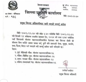 ३० चैत्र,पर्सा। पर्साको वीरगञ्जमा शनिबार साँझदेखि कर्फ्यु आदेश जारी भएको छ । दुई समुदायबिच भएको झडपले उग्र रूप लिएपछि जिल्ला प्रशासन कार्यालयले कर्फ्यु आदेश जारी गरेको हो ।